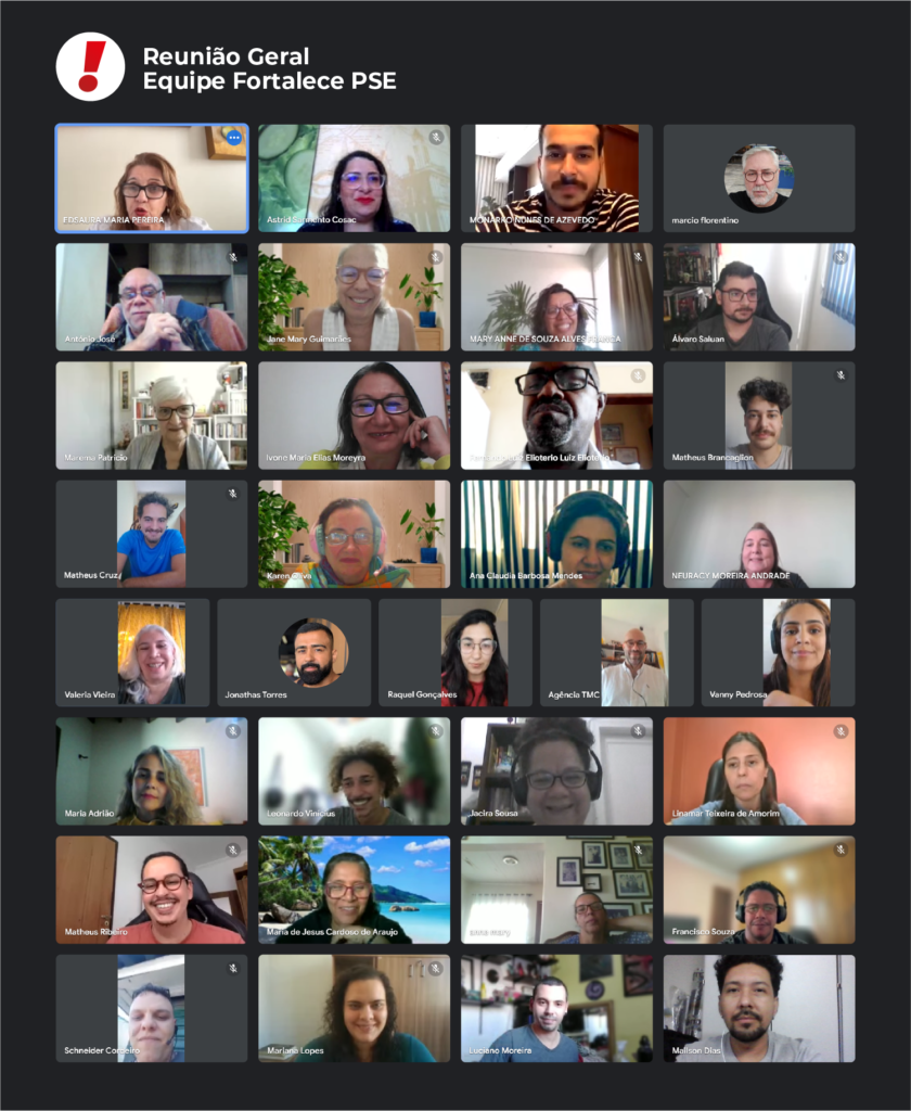 Neste primeiro momento o grupo do Fortalece PSE tem realizado diversas reuniões, para alinhamento de pautas e também com colaboradores, para a formação de apoio ao protagonismo juvenil e reorganização do PSE, haja visto que o projeto foi implementado em poucos lugares no país nestes 17 anos de criação.
