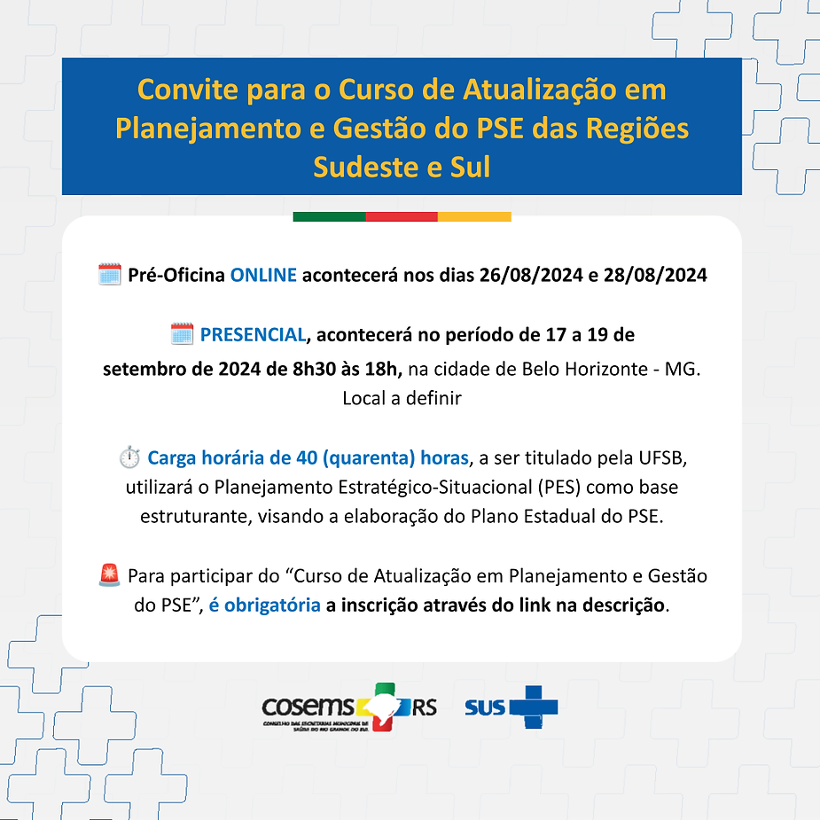 A Coordenação Geral de Equidade e Determinantes Sociais em Saúde do Departamento de Prevenção e Promoção da Saúde do Ministério da Saúde (DEPPROS/SAPS/MS) e a Coordenação de Estratégias da Educação Básica do Ministério da Educação (COGEB/SEB/MEC), em parceria com a Universidade Federal de Goiás (UFG) e a Universidade Federal do Sul da Bahia (UFSB), têm o prazer de convidá-los(as) para o “Curso de Atualização em Planejamento e Gestão do Programa Saúde na Escola (PSE)”.